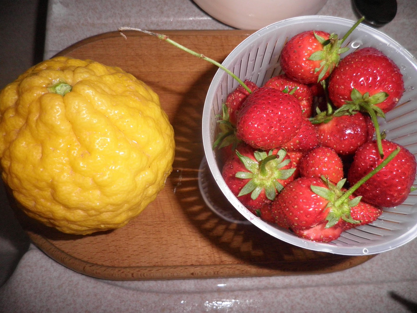 Vi ho già parlato del cedro, "pirettu" in dialetto ibleo: dato che il mio albero è particolarmente generoso, oggi lo voglio utilizzare come contenitore aromatico per le mie fragole. Le fragole biologiche sono buone al naturale, non hanno bisogno di condimenti particolari per la loro dolcezza. Le ho semplicemente lavate, tagliate, ho aggiunto un cucchiaio di zucchero di canna e le ho lasciate qualche minuto a rilasciare il loro fantastico succo. Le ho sistemate nei cestini di cedro ottenuti semplicemente svuotando i frutti e realizzando i manici con una fetta di scorza "appuntata" con degli stecchini. Un aroma e un profumo particolare sarà conferito alle fragole anche dal basilico appena colto!