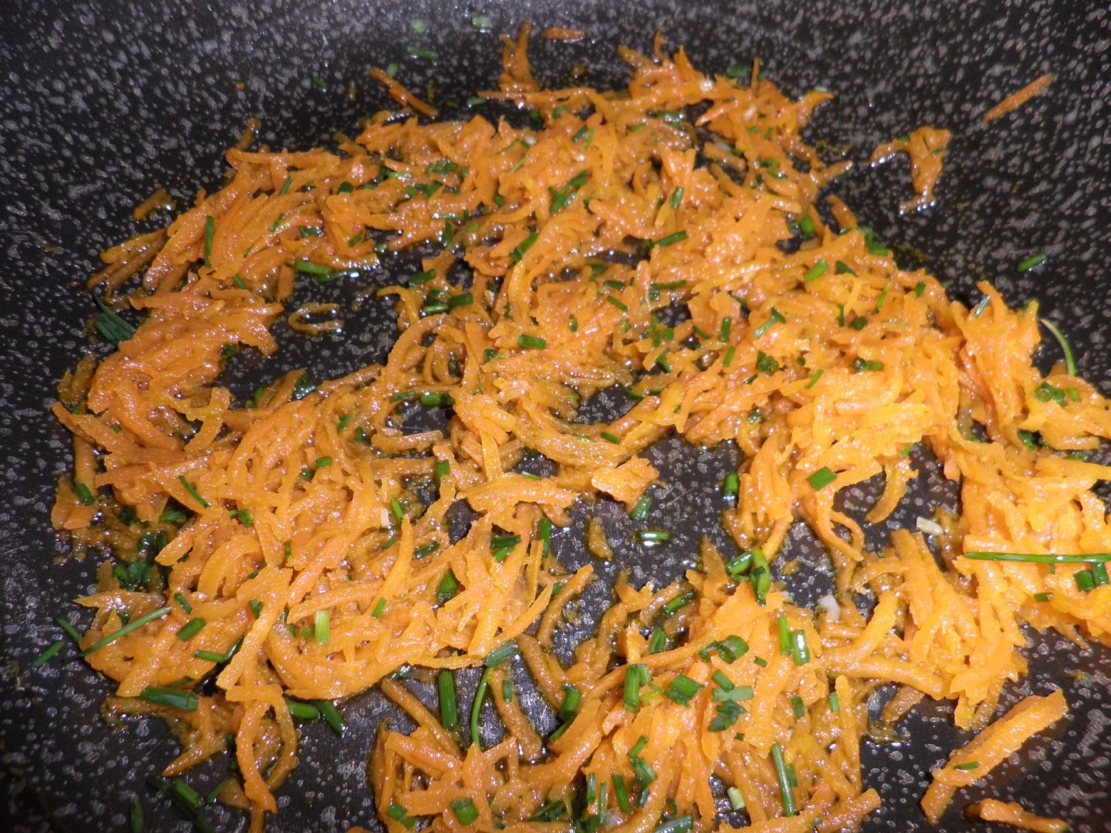 Mentre fate bollire l'acqua per la pasta, fate rosolare in padella l'olio e le carote tagliate a julienne; aromatizzate con erba cipollina, aggiustate di sale e se vi piace del pepe nero.
