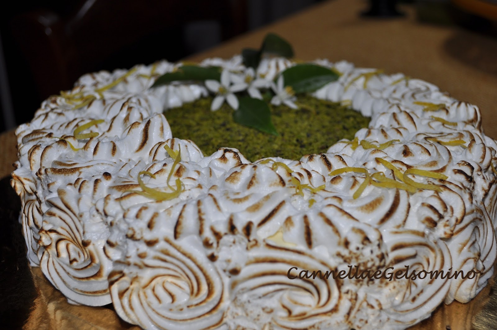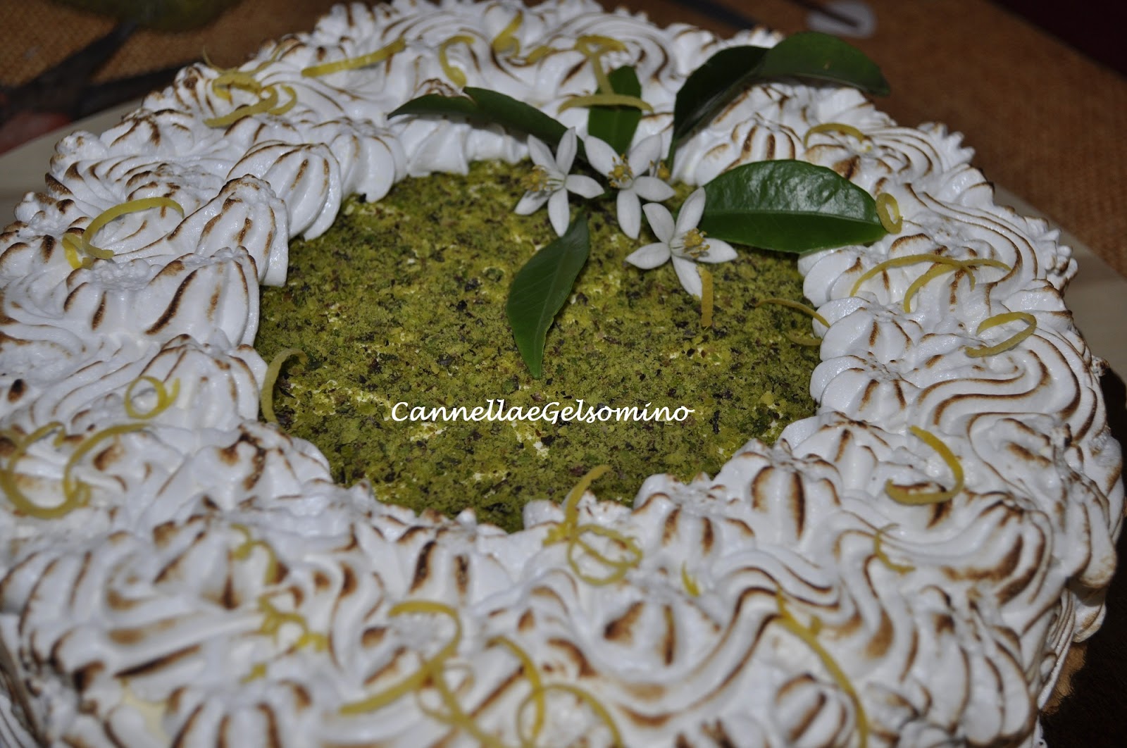 Decoriamo la superficie della torta con una sac à poche secondo il nostro gusto: io ho lasciato il centro scoperto e l'ho decorato con granella di pistacchi di Bronte. Con l'apposito cannello bruciacchiamo la meringa. Alla fine decoriamo la torta con zagare e foglie di limone o di altro agrume e scorzette di limone.