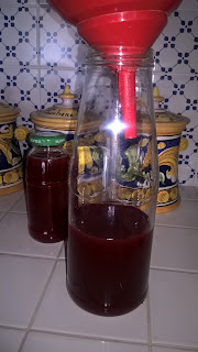 Passato questo tempo, filtro l'alcool che ha trattenuto tutti gli aromi e aggiungo 250 ml di acqua in cui ho fatto sciogliere a caldo 200 g di zucchero. Faccio raffreddare e unisco all'alcool.