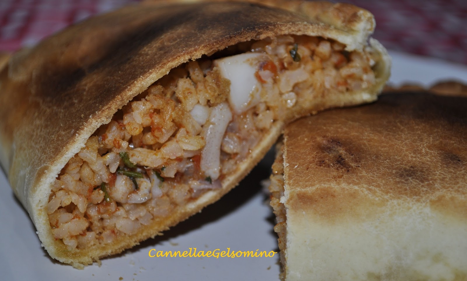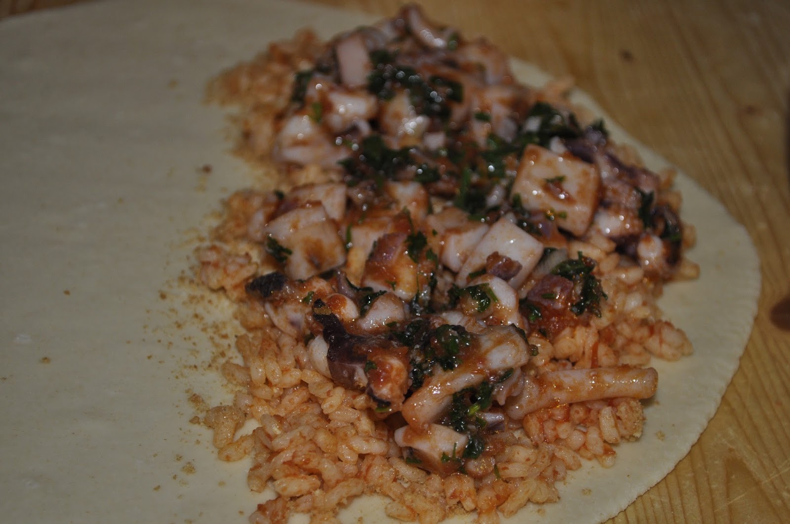 Ingredienti per il ripieno:2 seppie pulite, 2 patate, 100 g riso, salsa di pomodoro, 200 g pane grattugiato tostato, sale, pepe, aglio, prezzemolo, olio extravergine di oliva (con queste quantità potrete realizzare 4 piccole 'mpanate).