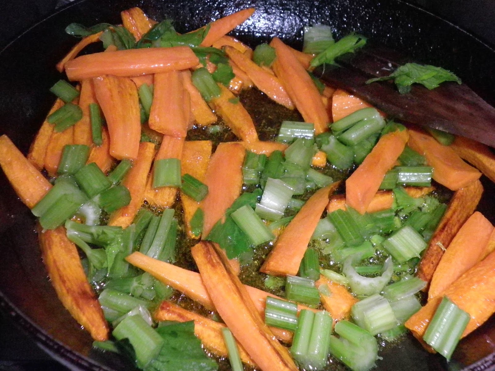 Fate la stessa cosa con carote e sedano (le proporzioni variano a seconda dei gusti personali). Potete fare altrettanto con delle listarelle di peperoni oppure melanzane. Gli ortaggi devono essere fritti separatamente perchè hanno tempi diversi di cottura.