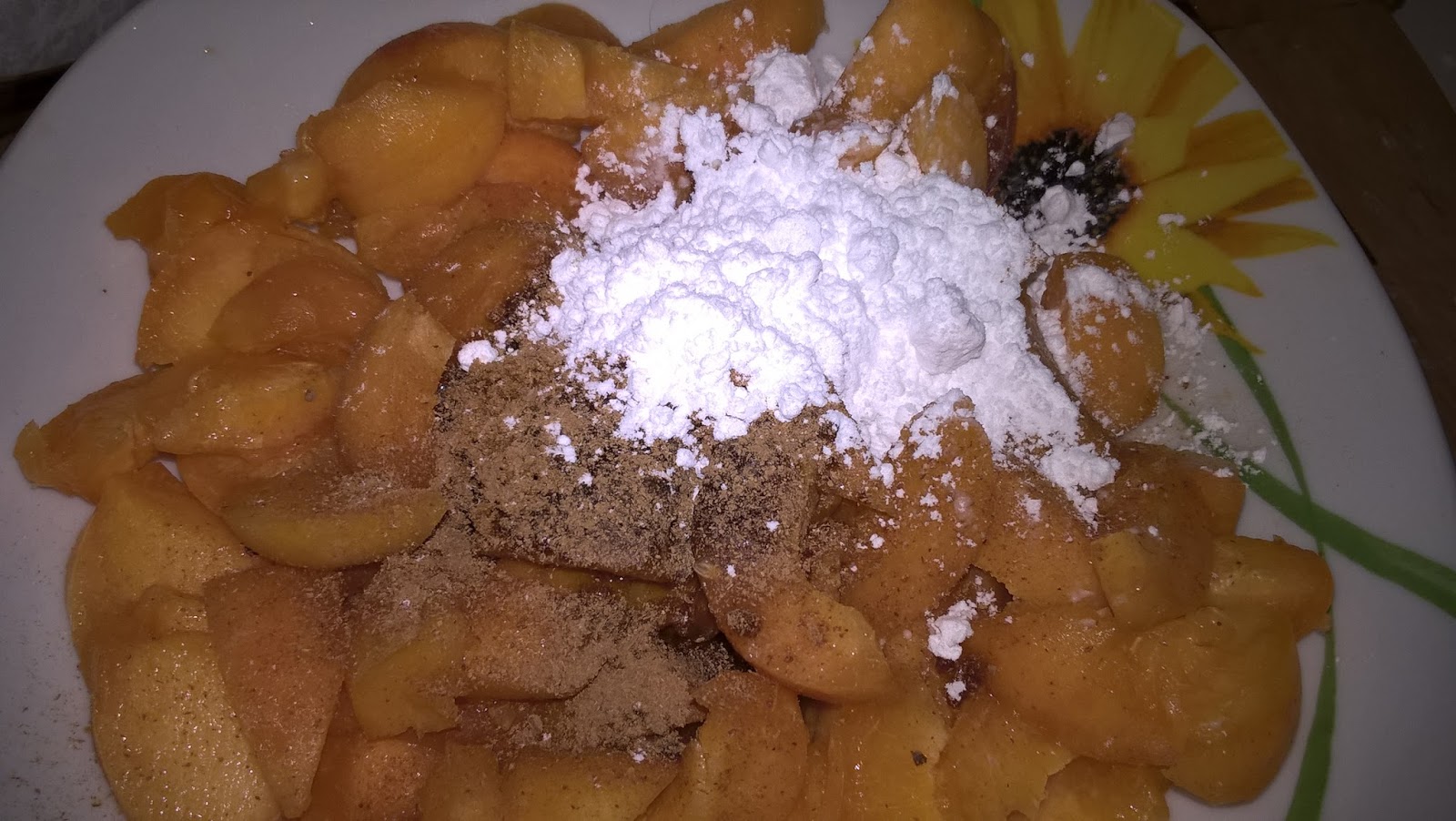 Per il ripieno prendo 500 g di albicocche, le taglio a pezzetti e le condisco con due cucchiai di zucchero di canna, della cannella e un cucchiaio di maizena che farà da addensante. Se vi piace il gusto più dolce aggiungete altro zucchero. Metto la frutta sulla base di frolla.