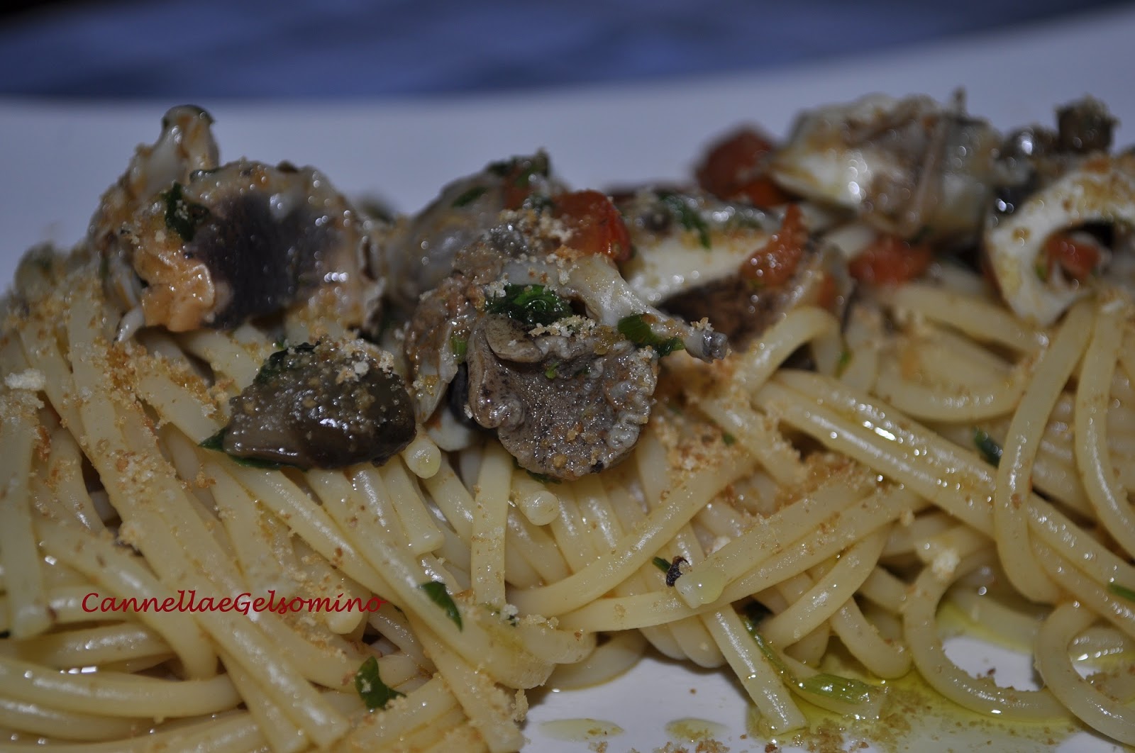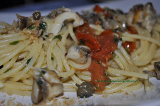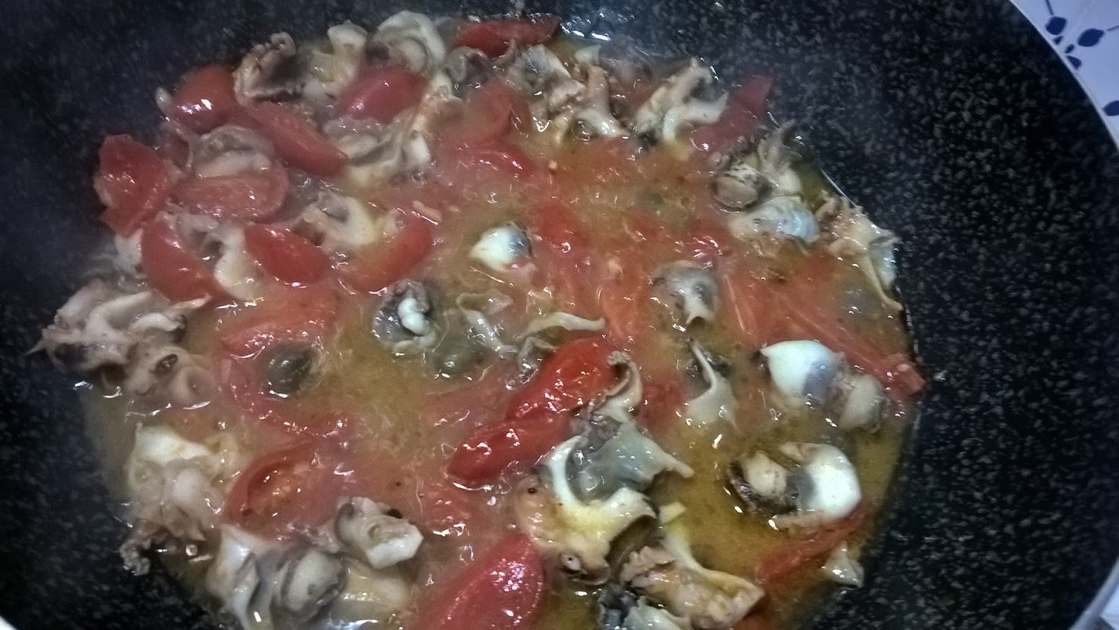 Aggiungo i murici, mezzo bicchiere di vino bianco e dei pezzetti di pomodorini. Faccio cuocere fino ad ottenere un sughetto non troppo liquido e infine regolo di sale, pepe nero e prezzemolo fresco tritato.