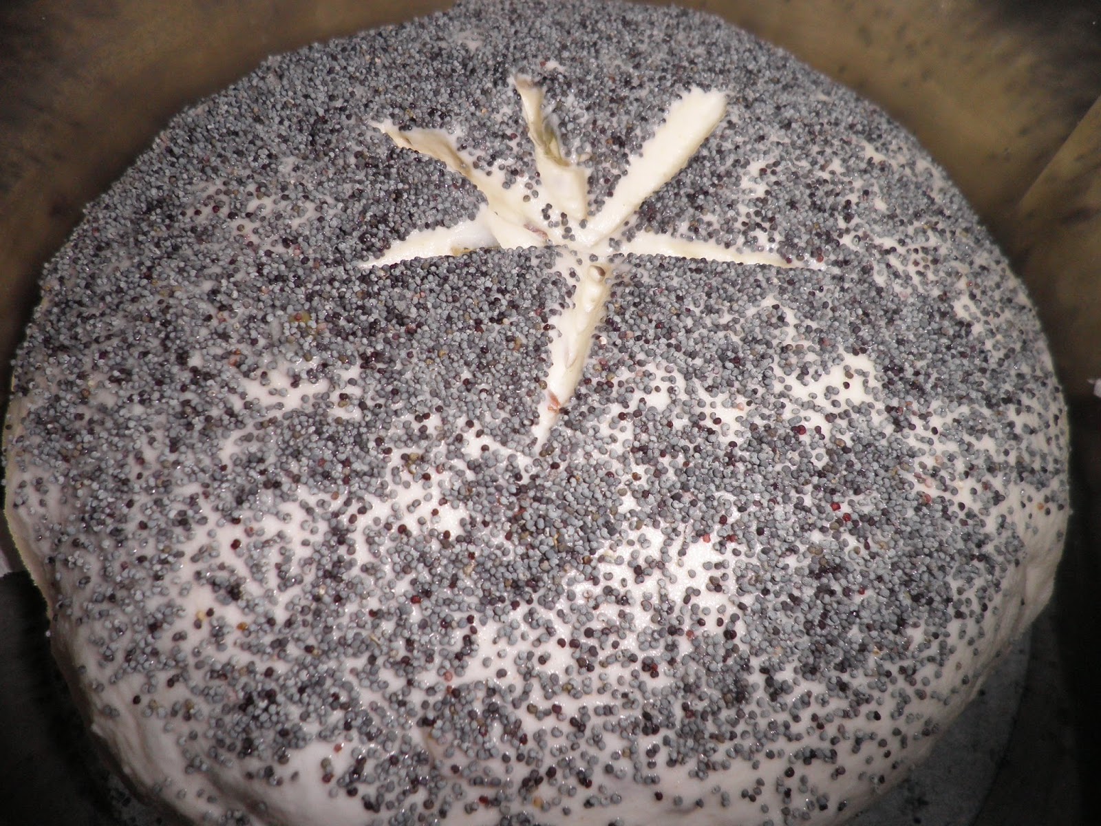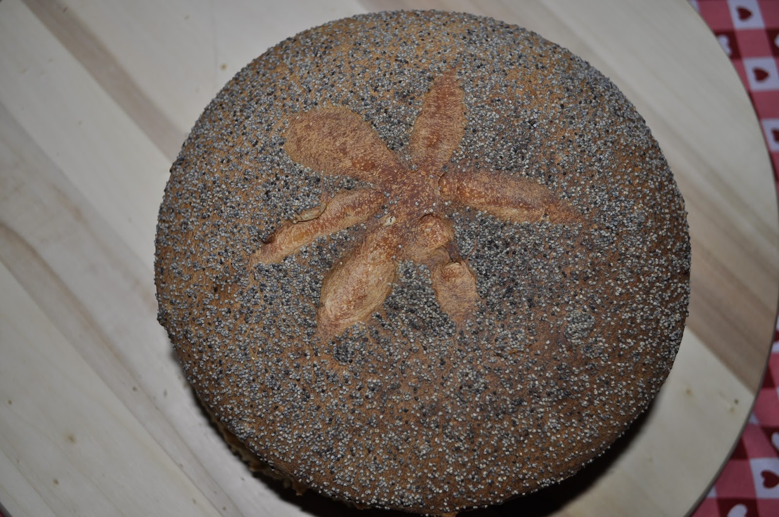 Mettete nell'impastatrice 200 g di lievito madre, 400 g di semola rimacinata di grano duro ( io utilizzo grani locali, in particolare la varietà Russello), 250 g di acqua, un cucchiaino di miele, semi di zucca, semi di girasole, semi di lino. Da ultimo aggiungete il sale. Formate la vostra pagnotta, cospargetela di semi di papavero dopo aver inumidito leggermente la superficie in modo che si attacchino. Mettete a lievitare coprendo con un canovaccio. La lievitazione può variare dalle 4 alle 6 ore.