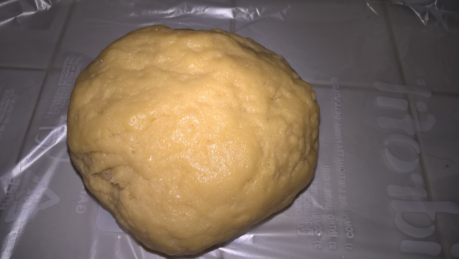 Impastare gli ingredienti fino ad ottenere una pasta morbida; metterla in un sacchetto per alimenti e farla riposare al fresco.