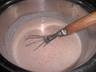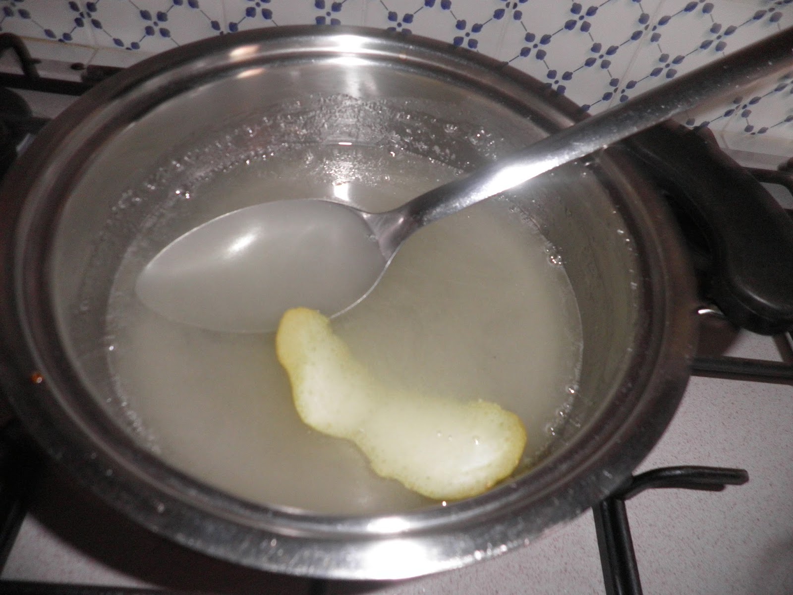 Sciogliete quindi lo zucchero e l'amido nel liquido filtrato, aggiungete una buccia di limone, rimettete il tutto sul fuoco e fate addensare.
