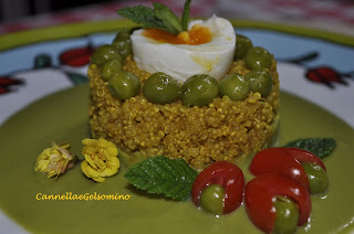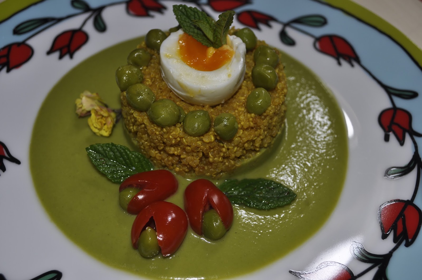 Per decorare il piatto preparate dei pomodorini datterini, foglioline di menta, pisellini interi, qualche fiore commestibile ( io ho trovato fiori di acetosella e violette). Disponete la quinoa sul piatto sopra la purea di piselli con un coppapasta, fate un incavo al centro con il cucchiaio e inserite mezzo uovo, decorate con il resto degli ingredienti.