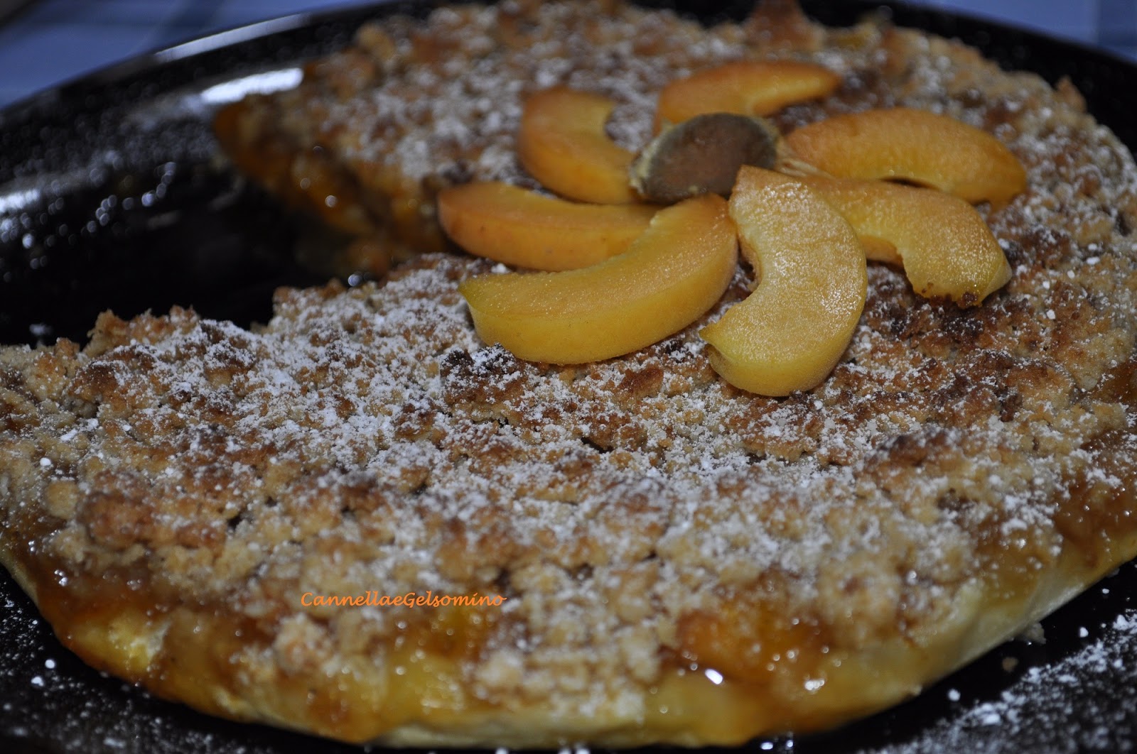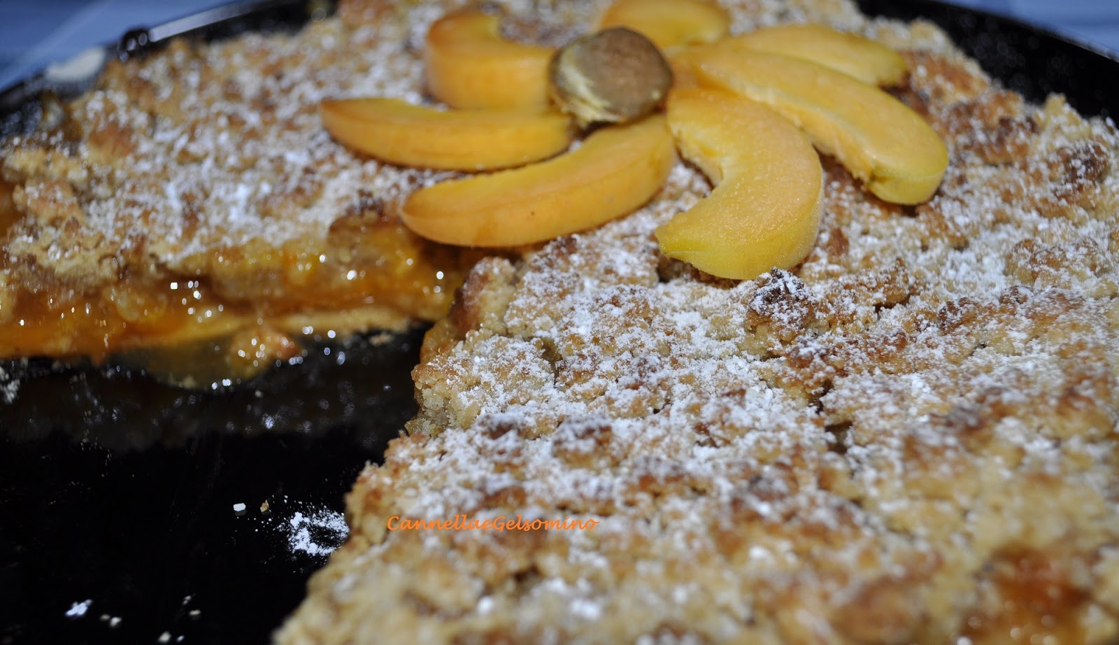 Inforno a 180° per 30 minuti, faccio raffreddare e decoro con zucchero a velo e fettine di albicocca.