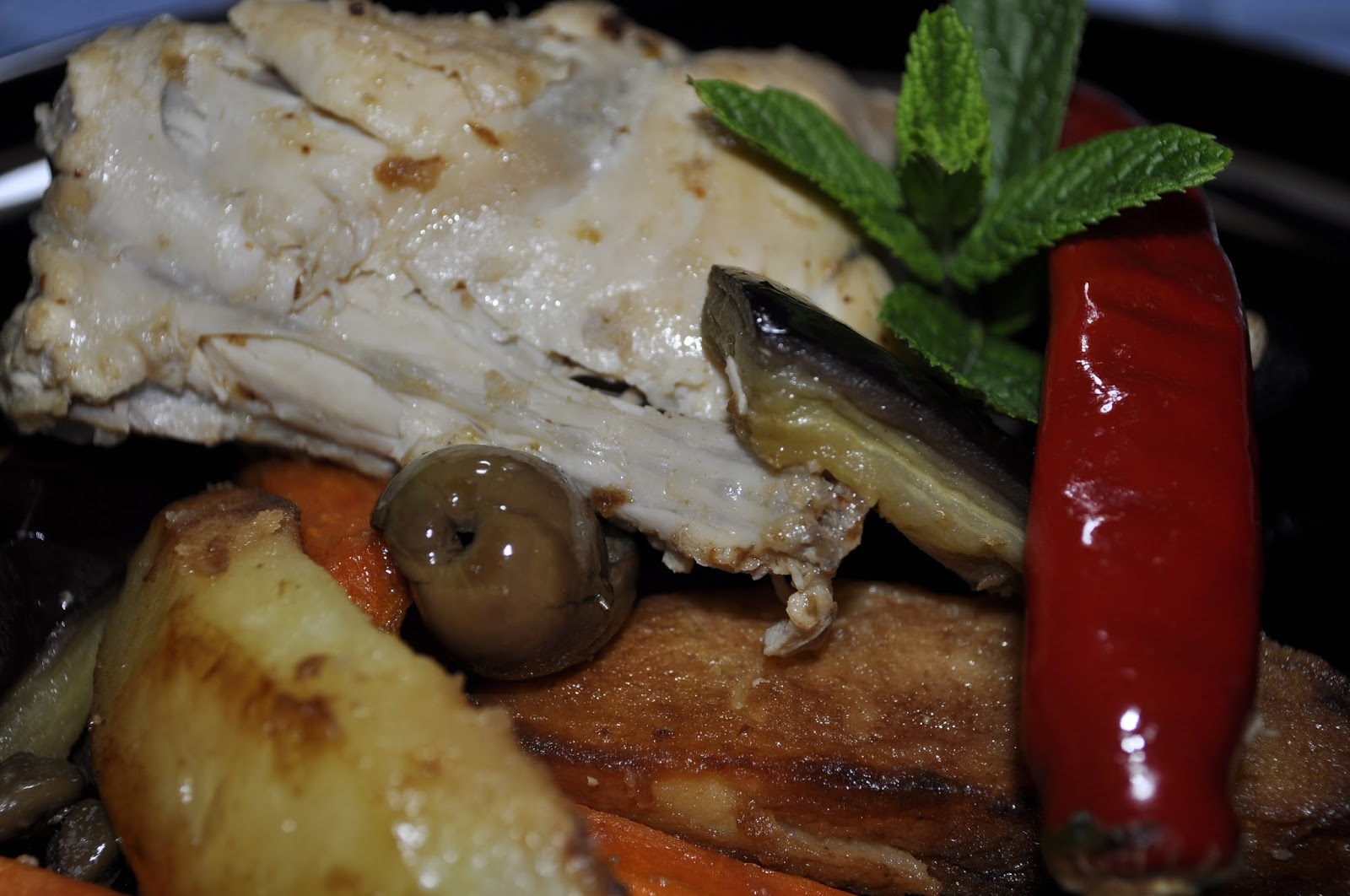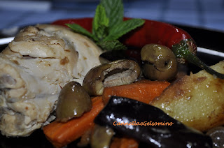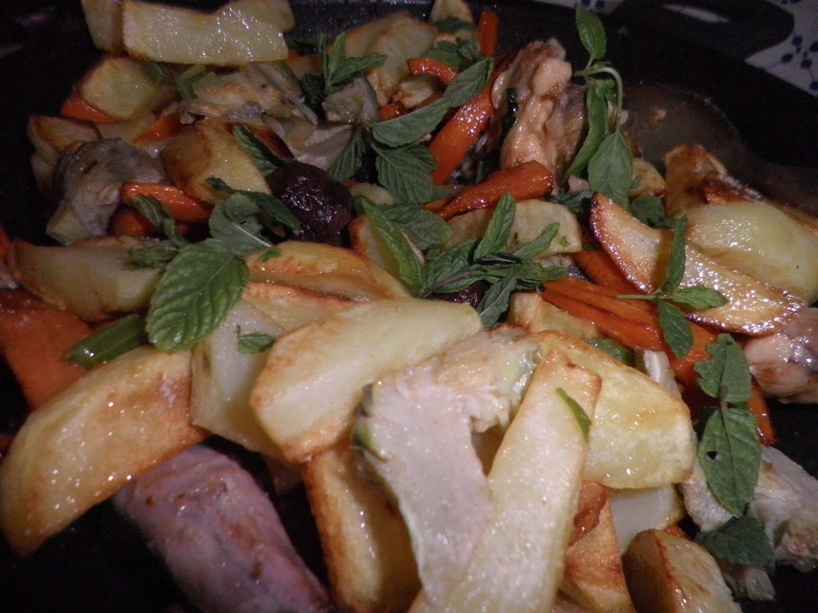 Unite gli ortaggi al coniglio insieme a una manciata di capperi, olive nere, un mazzetto di menta. Rimettete sul fuoco e fate insaporire tutto insieme; versate una spruzzata di aceto bianco e fate evaporare.