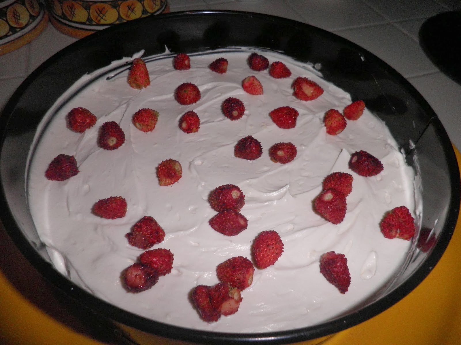 Aggiungete delle fragoline di bosco oppure dei pezzetti di cioccolato fondente. Ricoprite con l'altro disco di pan di Spagna e mettete in frigo a raffreddare per un paio d'ore.