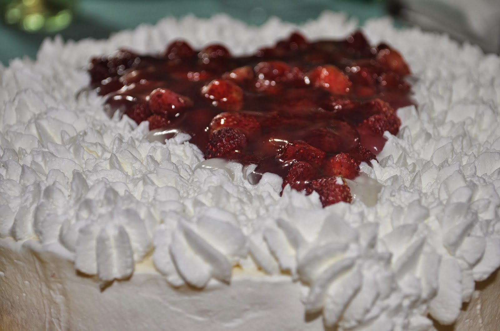 Decoratela come più vi piace: io avevo le fragoline e con esse ho composto un cuore circondato da ciuffetti di panna. Ho gelificato un po' le fragoline perchè dovevo tenere la torta in frigo, per evitare che si seccassero.