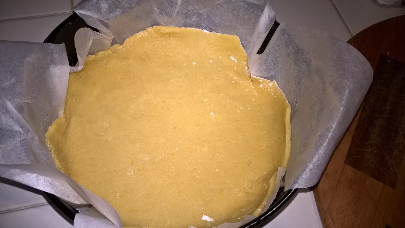 Preparate la frolla che più vi piace, con la farina integrale, con il burro o con l'olio, insomma fate voi. Io ho preparato la classica, l'ho fatta riposare in frigo e l'ho stesa per foderare la tortiera (250 g di frolla finita).