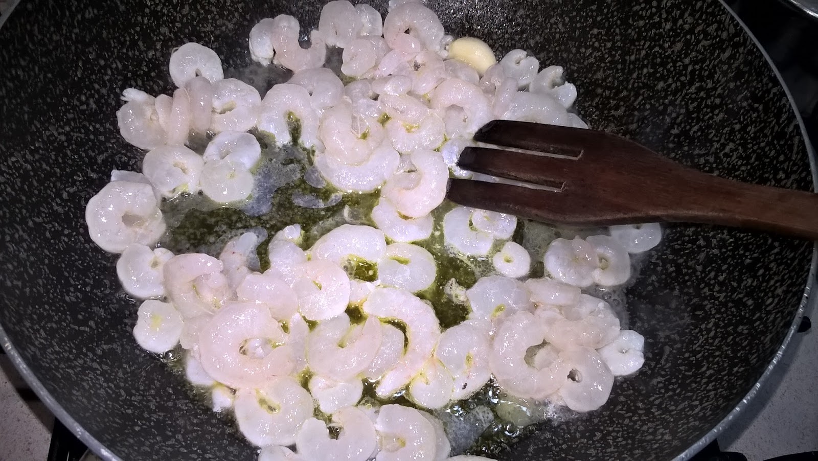 Dopo aver sgusciato i gamberi li faccio saltare in padella velocemente con olio exttravergine d'oliva e uno spicchio d'aglio.