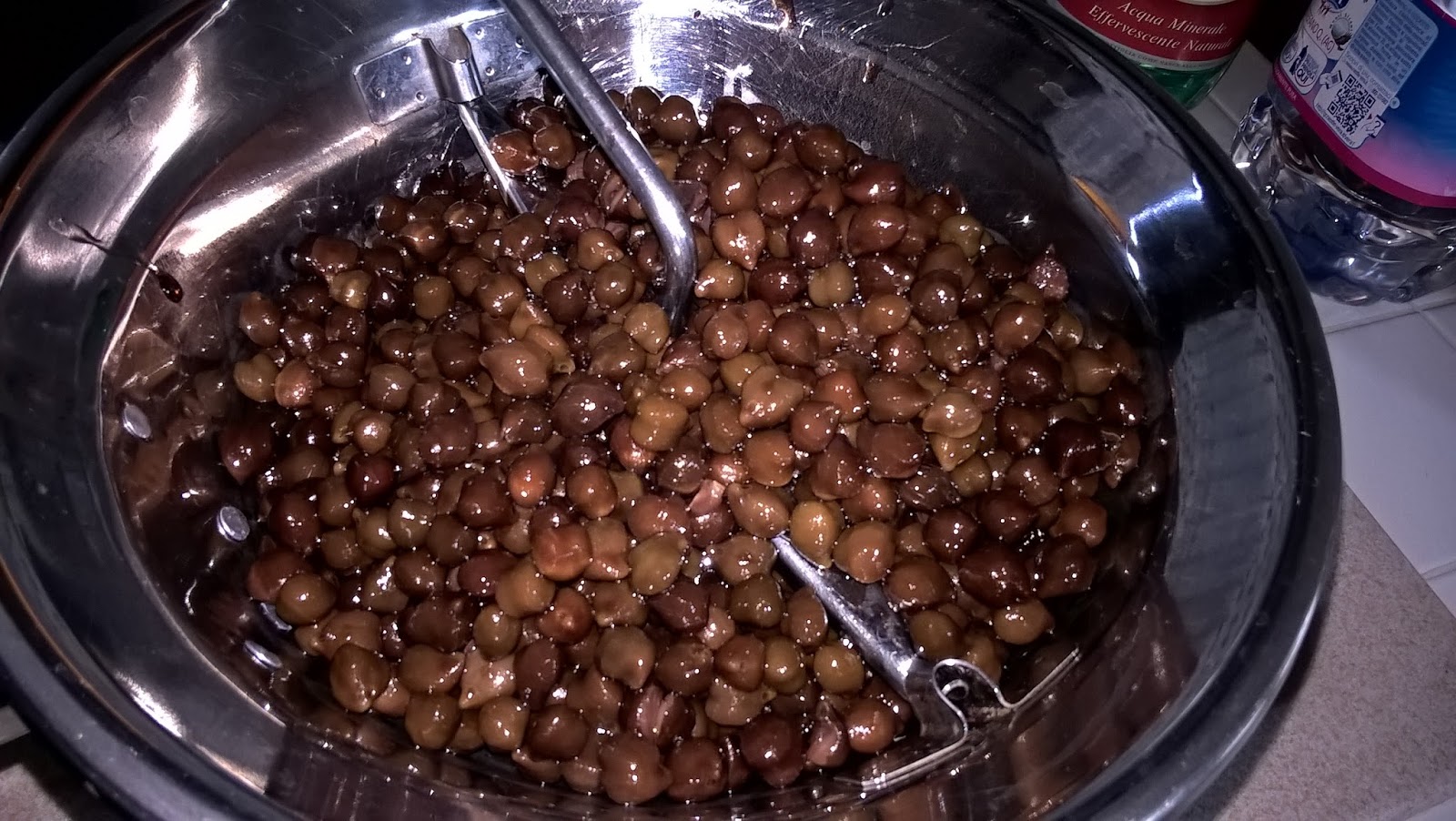 Ho tenuto a bagno i ceci per 12 ore, li ho lessati in acqua e qualche foglia d'alloro per una buona ora. Li ho passati al passaverdure.