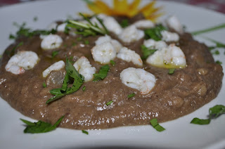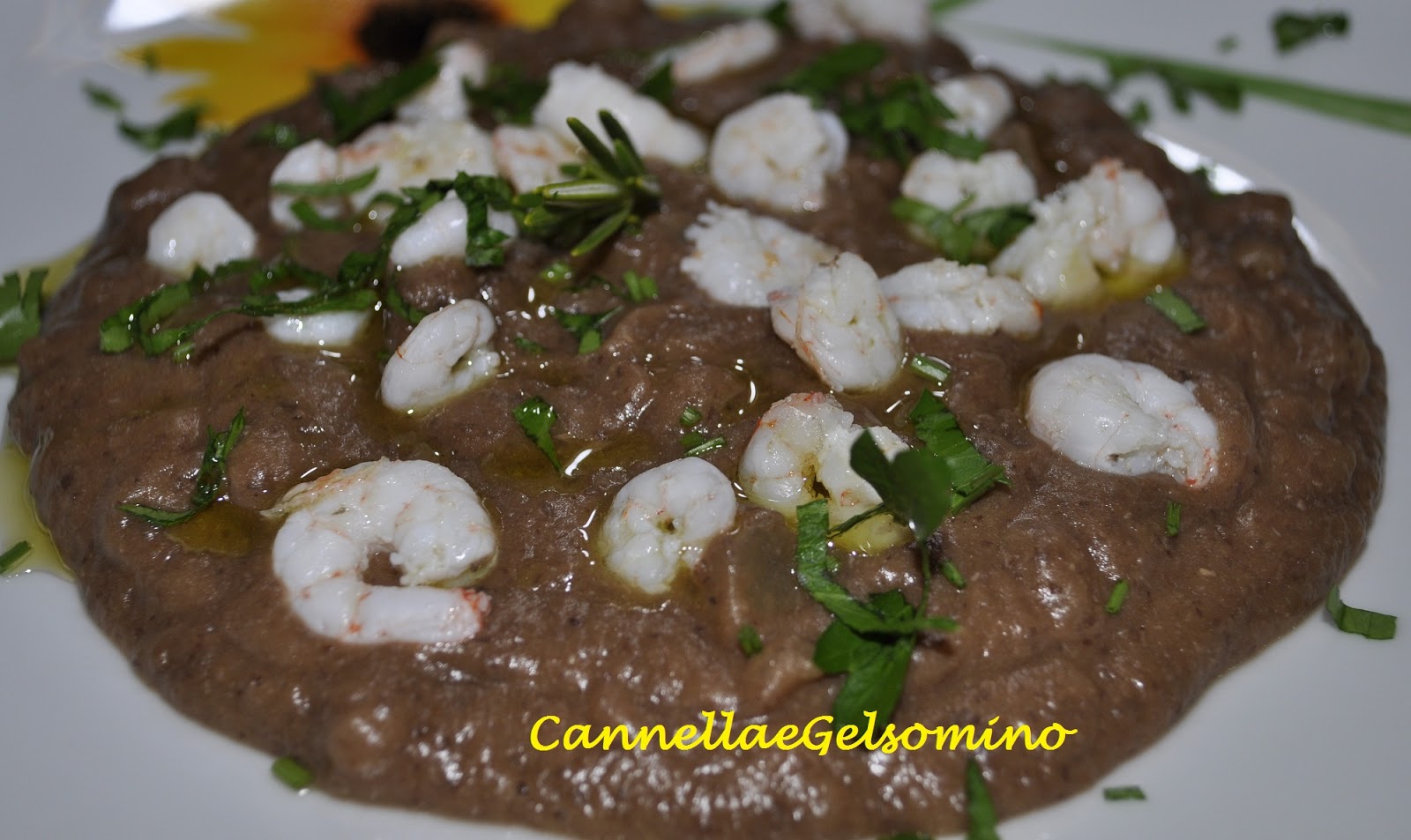 Faccio una base di vellutata sul piatto, dispongo sopra i gamberi e completo con prezzemolo tritato e olio a crudo. E' spettacolare anche fredda!