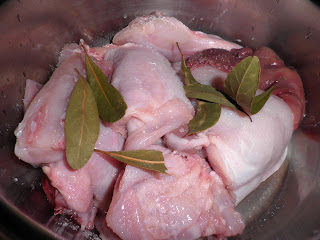 Tagliate il coniglio in pezzi e mettetelo in una casseruola a cuocere a fuoco lento con sale, pepe, foglie di alloro. Prima che abbia raggiunto la cottura sfumate con un bicchiere di vino bianco.