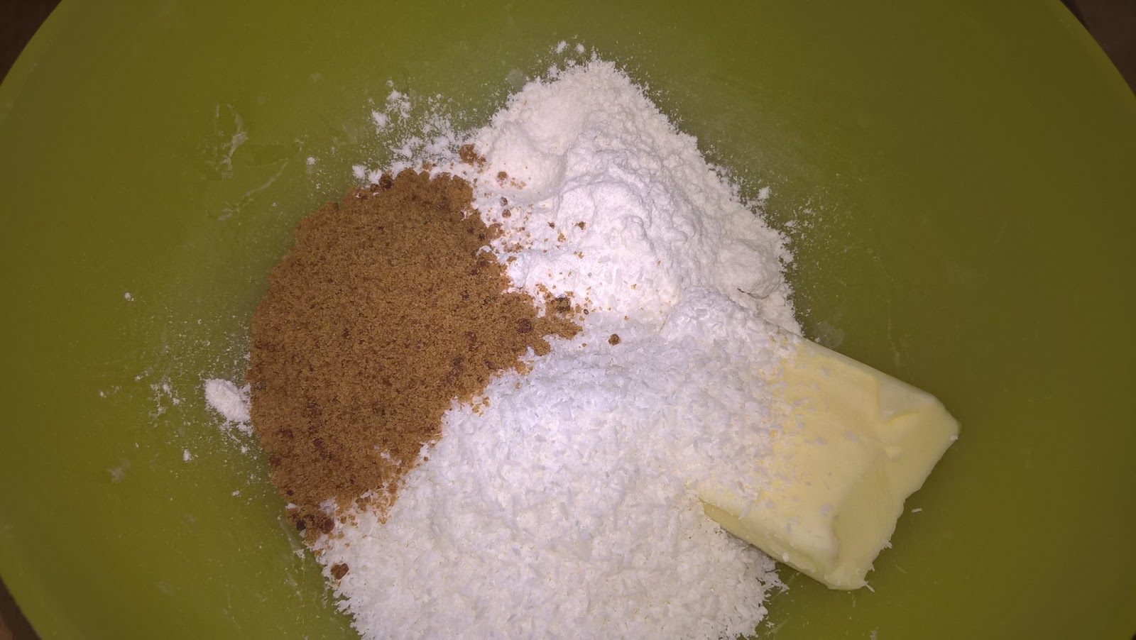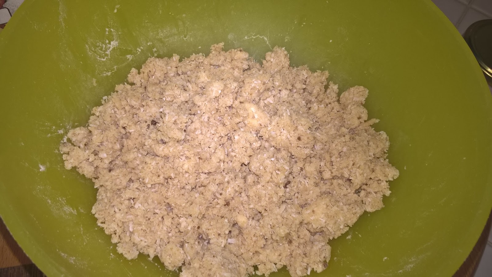 Per la sbriciolata impasto velocemente con la punta delle dita100 g di farina di cocco, 100 g di farina 00, 80 g di burro freddo e un cucchiaio di zucchero di canna. Otterrò un impasto granuloso con cui andrò a ricoprire la mia crostata.