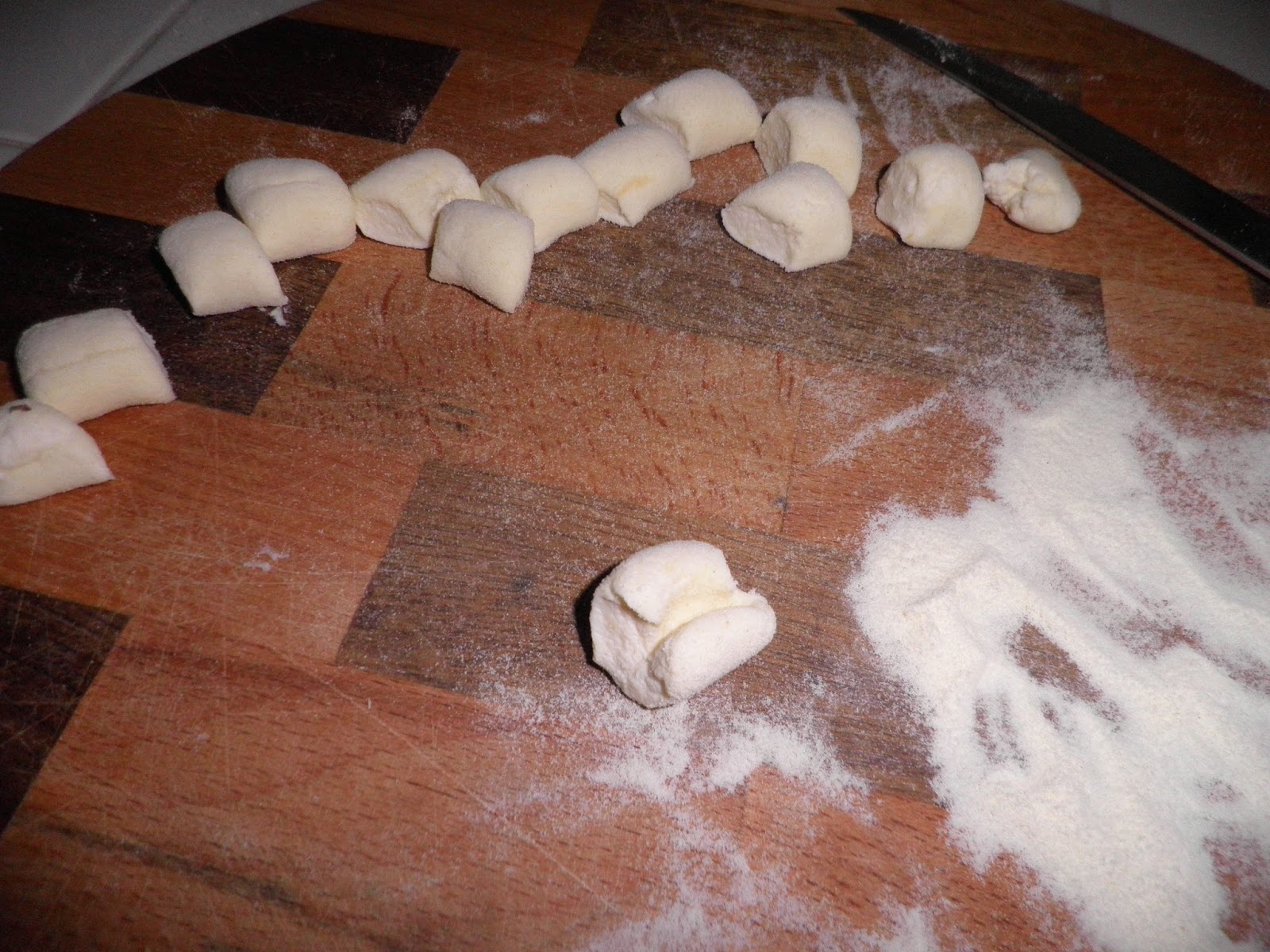 Formate dei rotolini su una spianatoia aiutandovi con un velo di farina per non farli attaccare; tagliateli a tocchetti e date loro la classica forma degli gnocchi.