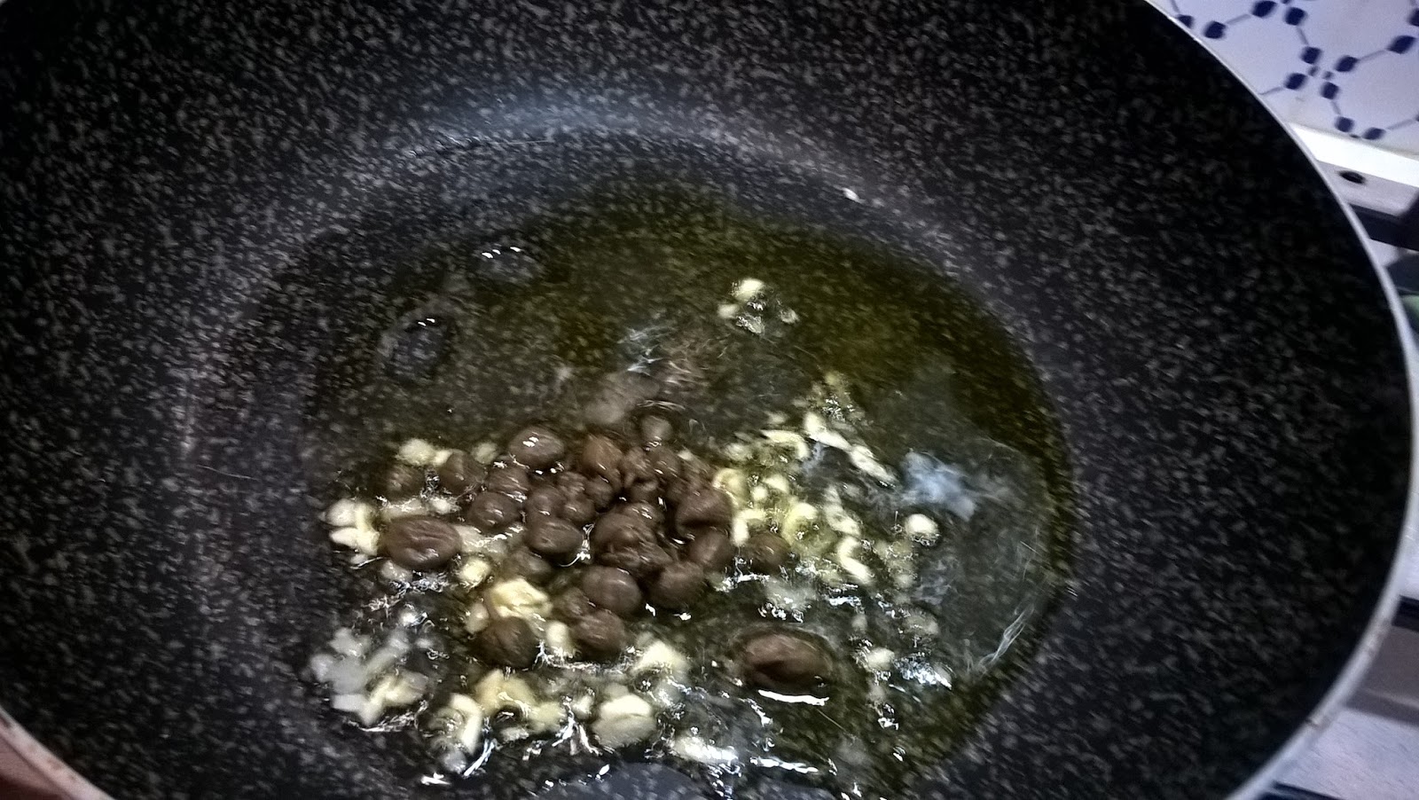 Faccio un soffritto con spicchi d'aglio tritati, capperi e olio extravergine d'oliva,