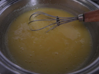 In una ciotola mescoliamo molto bene con la frusta 3 uova intere e 1 tuorlo, 200 g di zucchero, 150 ml di succo di limone e la buccia grattugiata di un limone. Intanto facciamo sciogliere in un pentolino 100 g di burro.