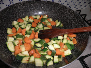 Fate rosolare una zucchina, una fetta di zucca e una carota in olio extravergine d'oliva (se vi piace aggiungete uno spicchio d'aglio). salate e pepate.