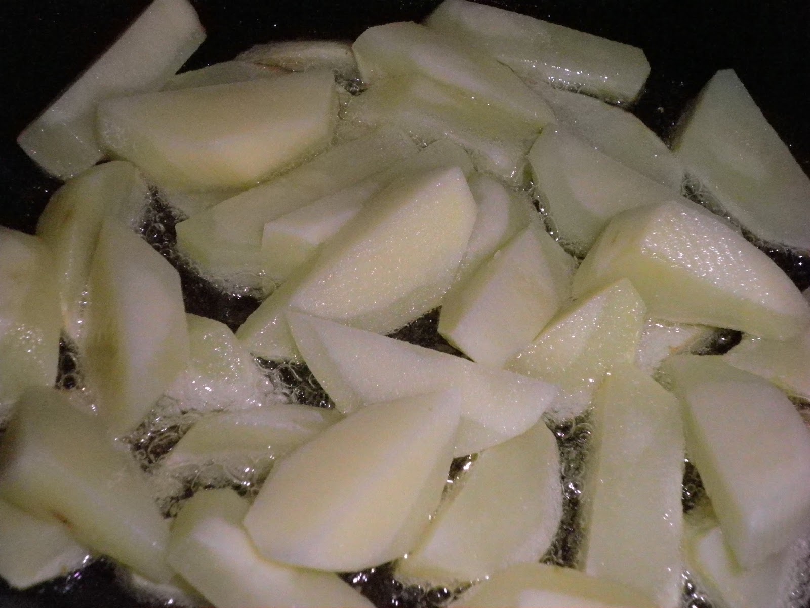Intanto che il coniglio cuoce tagliate non troppo sottilmente delle patate e friggetele. Fate asciugare l'olio in eccesso.