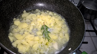 Intanto in una padella faccio rosolare una grossa patata tagliata a cubetti in olio extravergine d'oliva con un rametto di rosmarino. Aggiungo un pochino d'acqua per portare a cottura. aggiusto di sale e pepe. Con un mixer riduco in crema la patate e aggiungo la crema di ceci per fare insaporire il tutto.