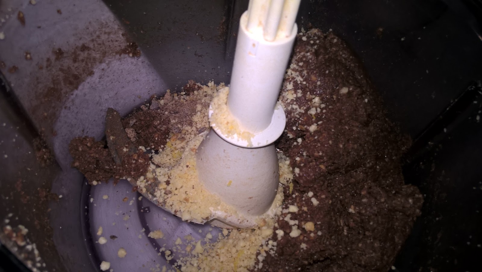 Mescolare, sempre nel mixer, la carne, le mandorle, lo zucchero, gli aromi, il cioccolato, la buccia grattugiata di un limone, il cacao e le chiare. Se la farcia risultasse dura aggiungete un altro poco di albume.